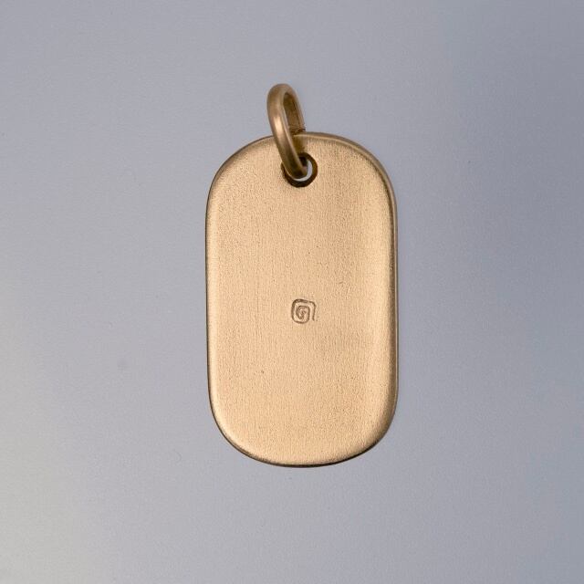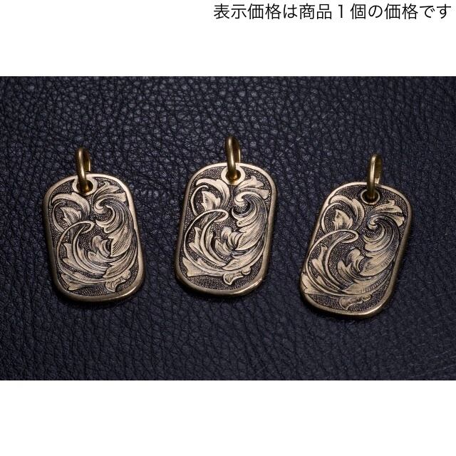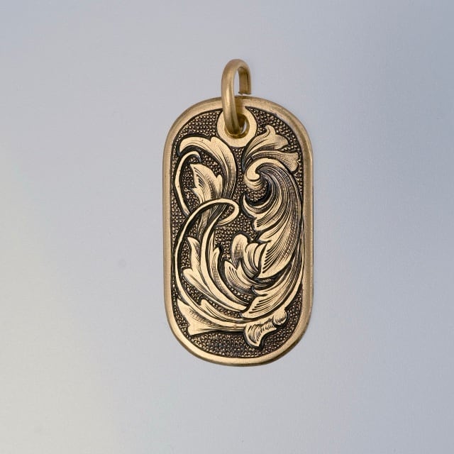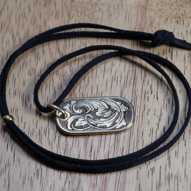アメリカンスクロールにブラックリーフを加えた彫金ペンダントです。背景はスティップリングでクラシカルなイメージに仕上げました。ドッグタグをモチーフにした形状です。